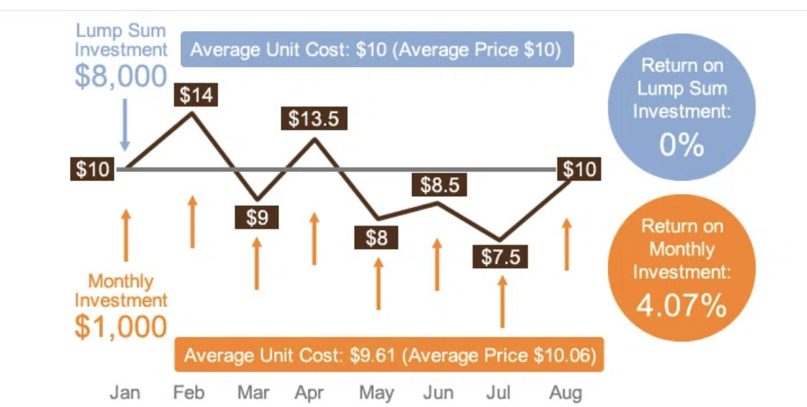 하락장에 같은 금액을 투자하여 저렴한 가격에 더 많은 주식의 수를 보유 할수 있기 때문에 결과적으로 많은 수익률을 얻어 갈 수 있는 것입니다.