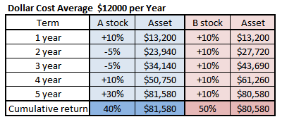 하락장을 격은 A의 주식을 매년 $12,000(1500만원)꾸준히 적립식으로 매수 했을 경우에 5년 후에는 $81,580이 됩니다, 하지만 매년 10% 꾸준히 오른 B주식은 같은 금액을 투자해도 $80,580이 되어 $1,000의 자산이 차이가 납니다. $1000 정도야 큰 차이가 아니라고 생각하시겠지만 수익률을 비교해서 보시면 하락장을 격은 A주식은 수익률이 40%이고 하락장을 격지 않은 B 주식은 50%의 수익률을 보입니다. 그럼에도 불구하고 하락이 있었던 40%의 수익률을 낸 A주식이 더 많은 수익률을 냅니다. 그러면 하락장을 격은 A주식이 50%의 수익률이 되면 저 큰 수익률을 얻어간다는 것입니다.