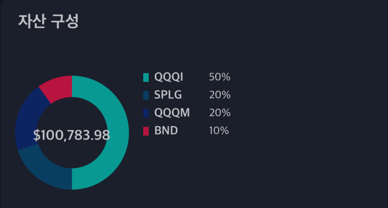 그래서 S&P500 지수를 추종하는 ETF(SPY or VOO or SPLG) 20%와 Nasdaq 지수를 추총하는 ETF(QQQ or QQQM) 20%를 포함시켜 총 40%의 비중으로 QQQI의 부족한 성장성을 커버 해주도록 하는 것입니다.