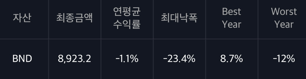 최근 10년 BND의 연평균 수익률은 -1% 였습니다. 다행이 4% 조금 안되는 배당을 주기에 2.5% 정도의 수익은 얻었지만 채권도 수익성을 바라기 보다는 현금 자산에 대한 인플레이션 헷지 수단의 정도로 보는게 좋습니다.