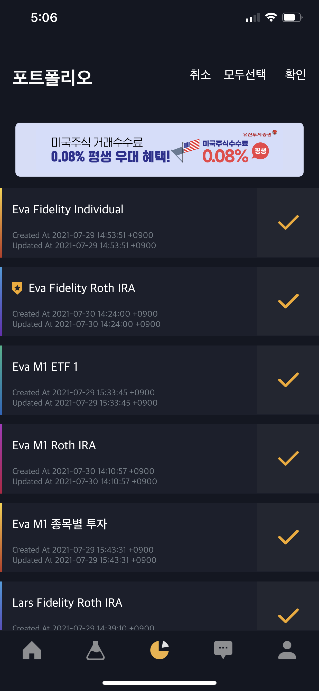모든 자산을 입력 하셨다면 모두 선택을 선택하시고 확인을 누르시면 자신의 포트폴리오가 나옵니다.