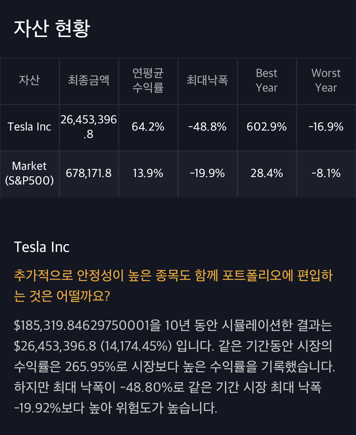 수익률은 압도적으로 높지만 변동성이 심해 최대 48.8%의 낙폭을 감당해야 한다는 내용의 결과가 나옵니다.