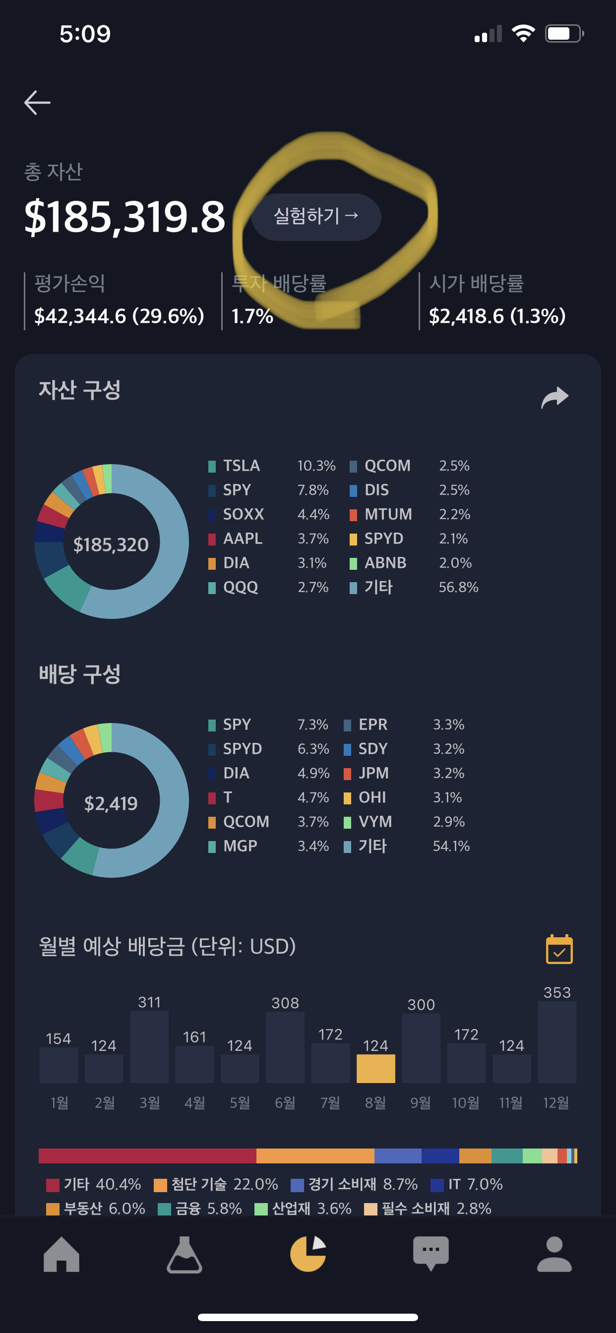 먼저 나의 자산 포트폴리오를 입력하거나 직접 계좌와 연동하셔야 합니다. 그러면 이런 화면이 나옵니다.
