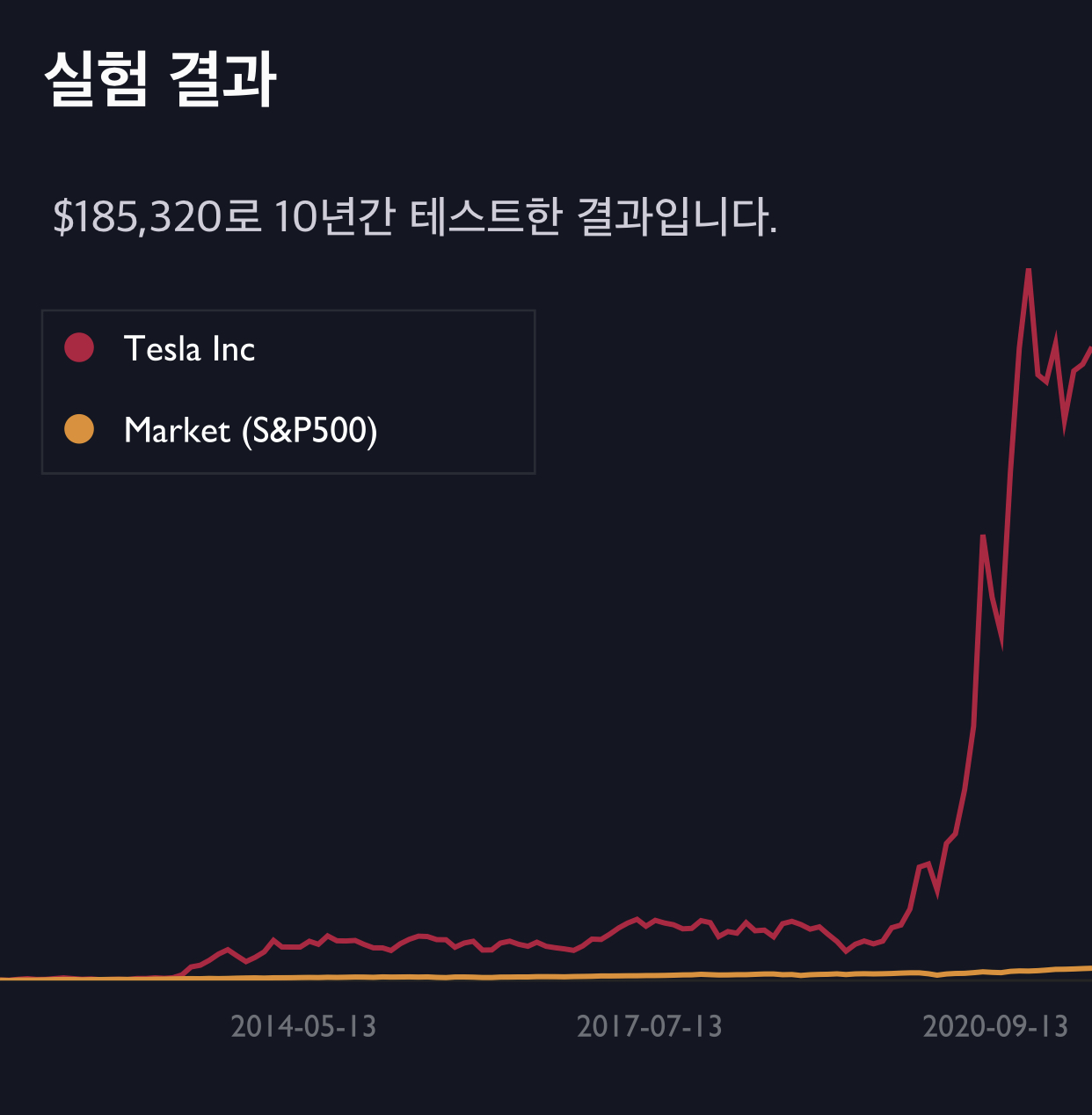 그리고 만일 내가 어느 종목을 투자하고 싶은데 10년후 결과가 어떨지 궁금하시다면 아래 그림과 같이 테슬라 종목을 입력하신후 1만불을 투자하여 10년을 테스트 해보시면 됩니다.