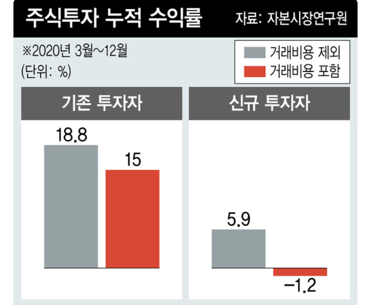그리고 이번에 새로 주식을 시작하신 분들은 5.9%의 적은 수익을 올렸지만 수많은 거래로 인해 수수료로 7.1%의 내고 -1.2%의 마이너스 수익을 낸것입니다.