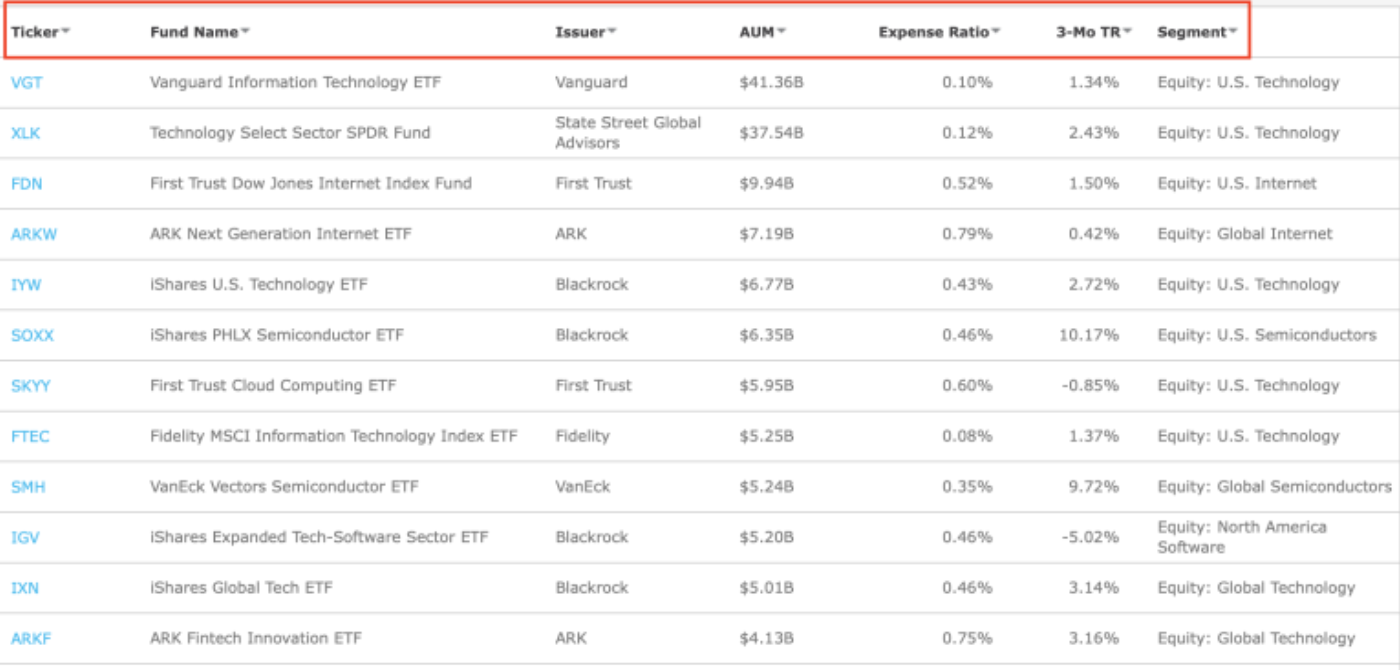 만일 기술주 ETF를 투자 하시고 싶으시면 테크놀러지ETF를 클릭하시고 밑으로 내려가면 ETF 리스트가 있습니다.