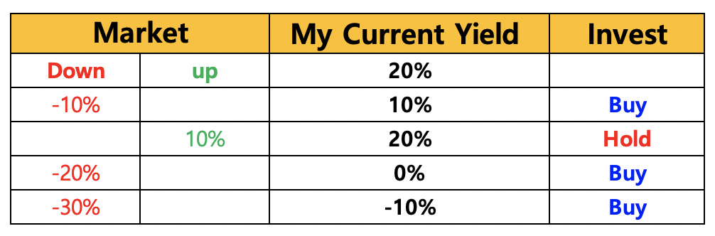 내 기준 수익률에서 10%가 떨어 질때 마다 $500을 투자 한다고 정했다면 $500을 투자합니다.