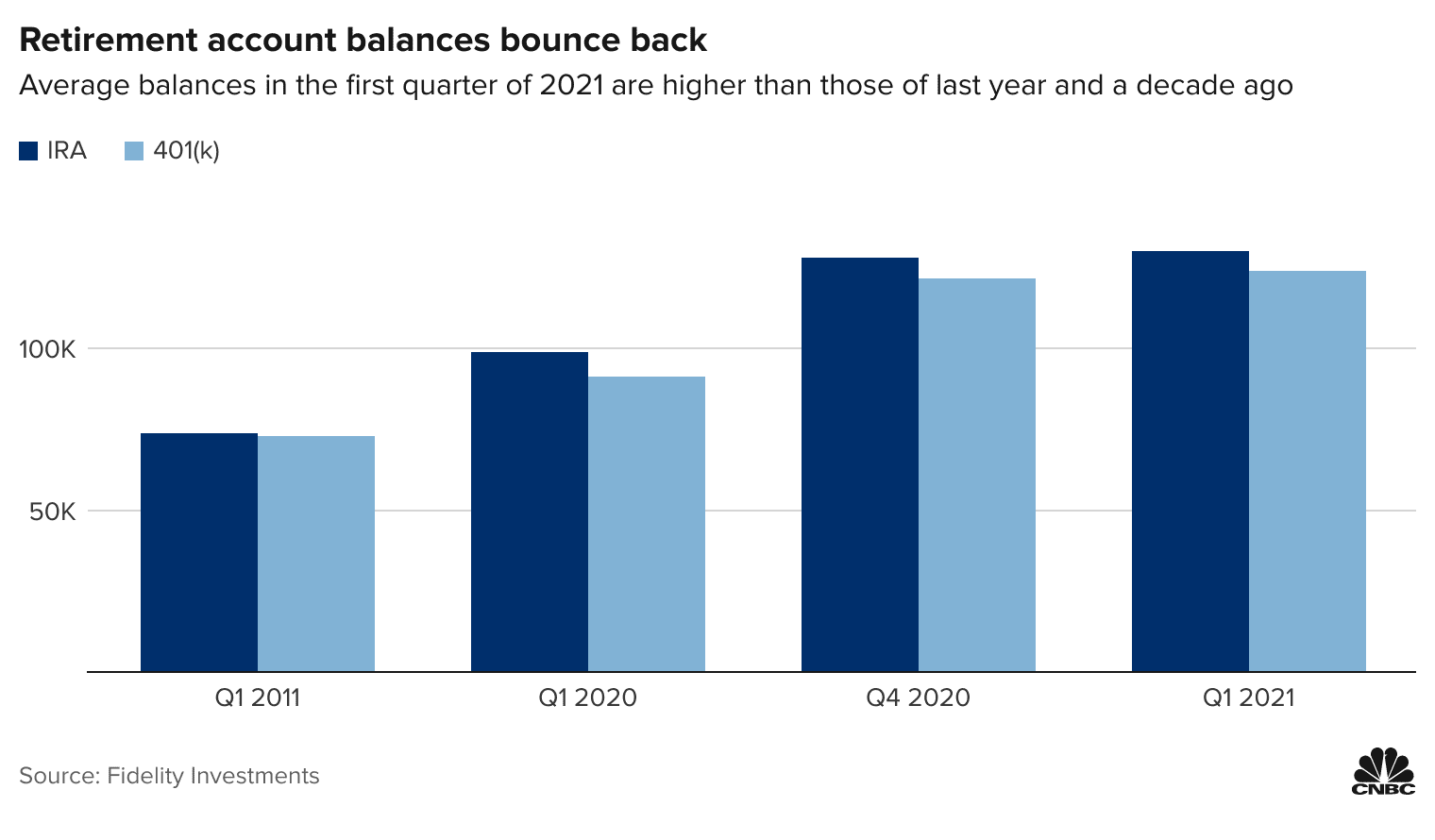 잔액이 100만 달러 이상인 피델리티 401(k) 계좌수는 2021년 1분기에 최고치인 365,000개로 뛰어올랐고 IRA 백만장자의 수는 307,600명으로 증가했고 사상 최고치를 기록다고 합니다. 즉 은퇴 백만장자의 총 수는 2020년 1년 전보다 두 배 이상 증가한 것입니다.