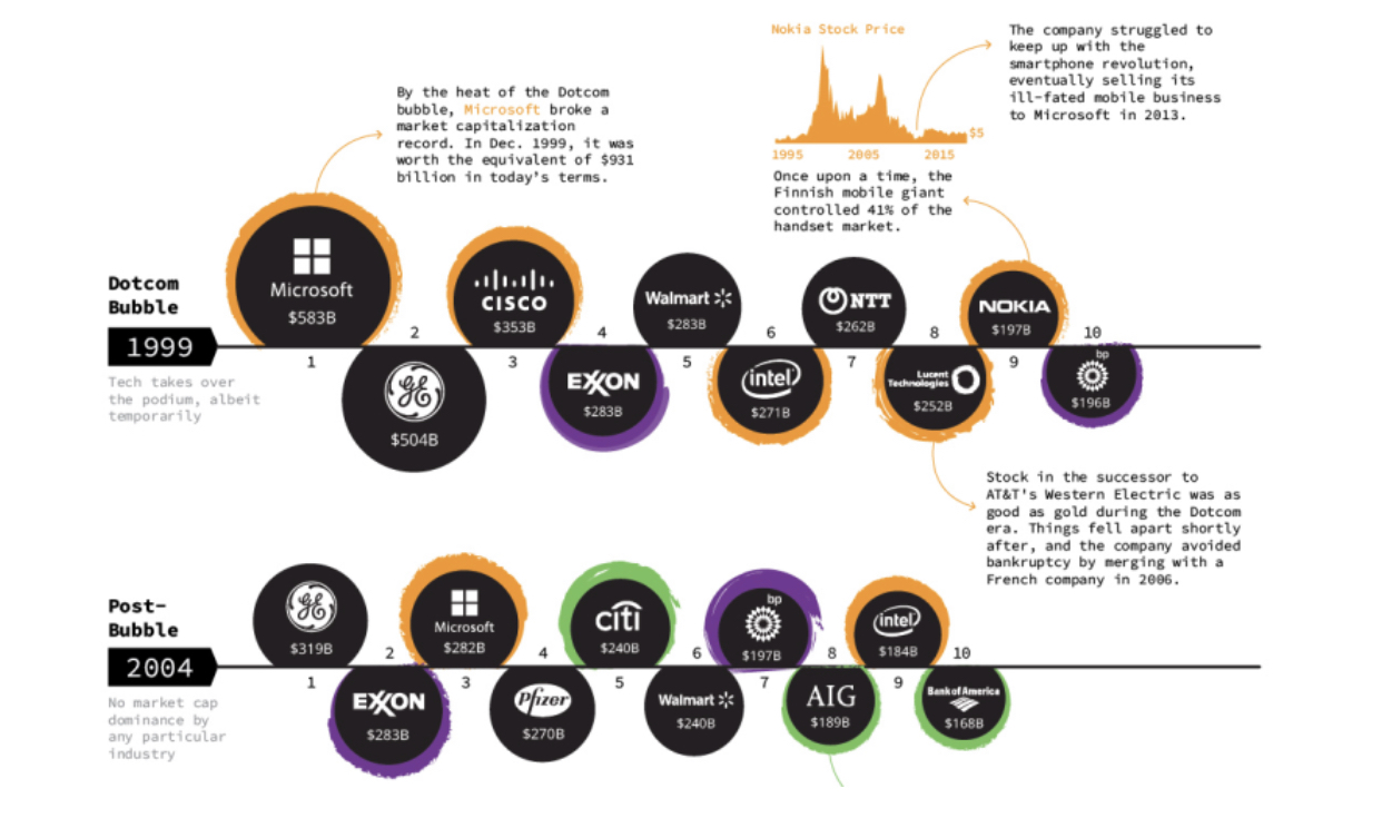 데이터상 20년전 시총 1위는 GE 였습니다. 그후로 10년이 지나고 1999년 도에는 마이크로소프트가 시총 1위 입니다. 현재는 애플이 시총 1위를 유지하고 있고 20년전 시청 1위였던 GE는 순위에서 사라져 버렸습니다.