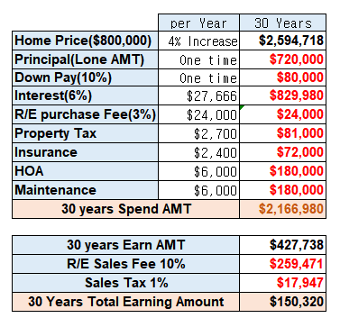 30년이 지나고 260만불의 오른 집값에서 30년 동안 내 주머니에서 나간 돈을 전부 계산해 보겠습니다. 원금(다운페이 포함) 80만불, 이자 $829,980, 부동산 FEE 3% $24,000, Property Tax $81000, 보험 $72,000, HOA $180,000, 유지보수비 $180,000 하면 종합 $2,166,980 이라는 내 주머니에서 빠져 나갔습니다.