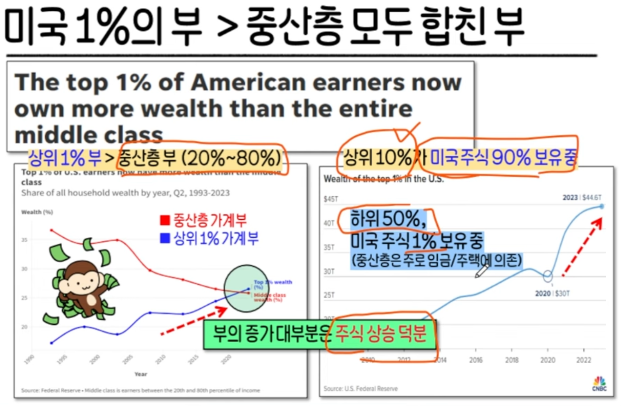 최근 미국의 상위 1% 부자들은 미국 주식의 반이상을 소유하고 있고 미국의 상위 10%가 미국 주식의 90%를 소유하고 있다는 CNBC통계가 있습니다.