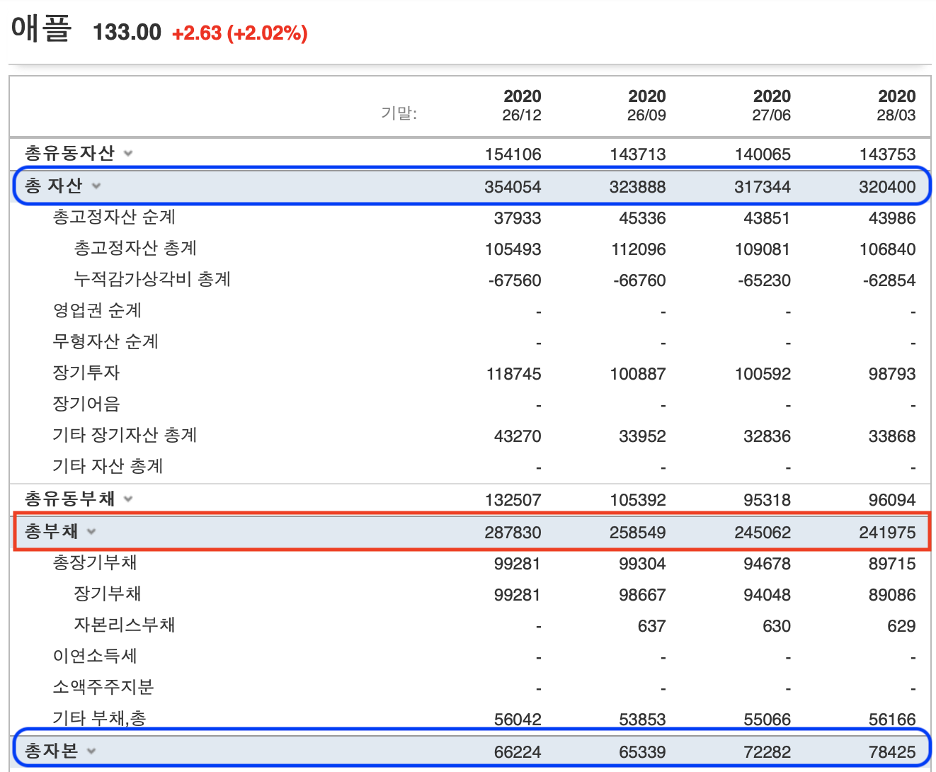 위의 그림을 보시면 애플의 총 자산이 나와 있습니다. 거기에 총 부채를 빼봅니다. 그러면 아래에 총 자본이 나옵니다.