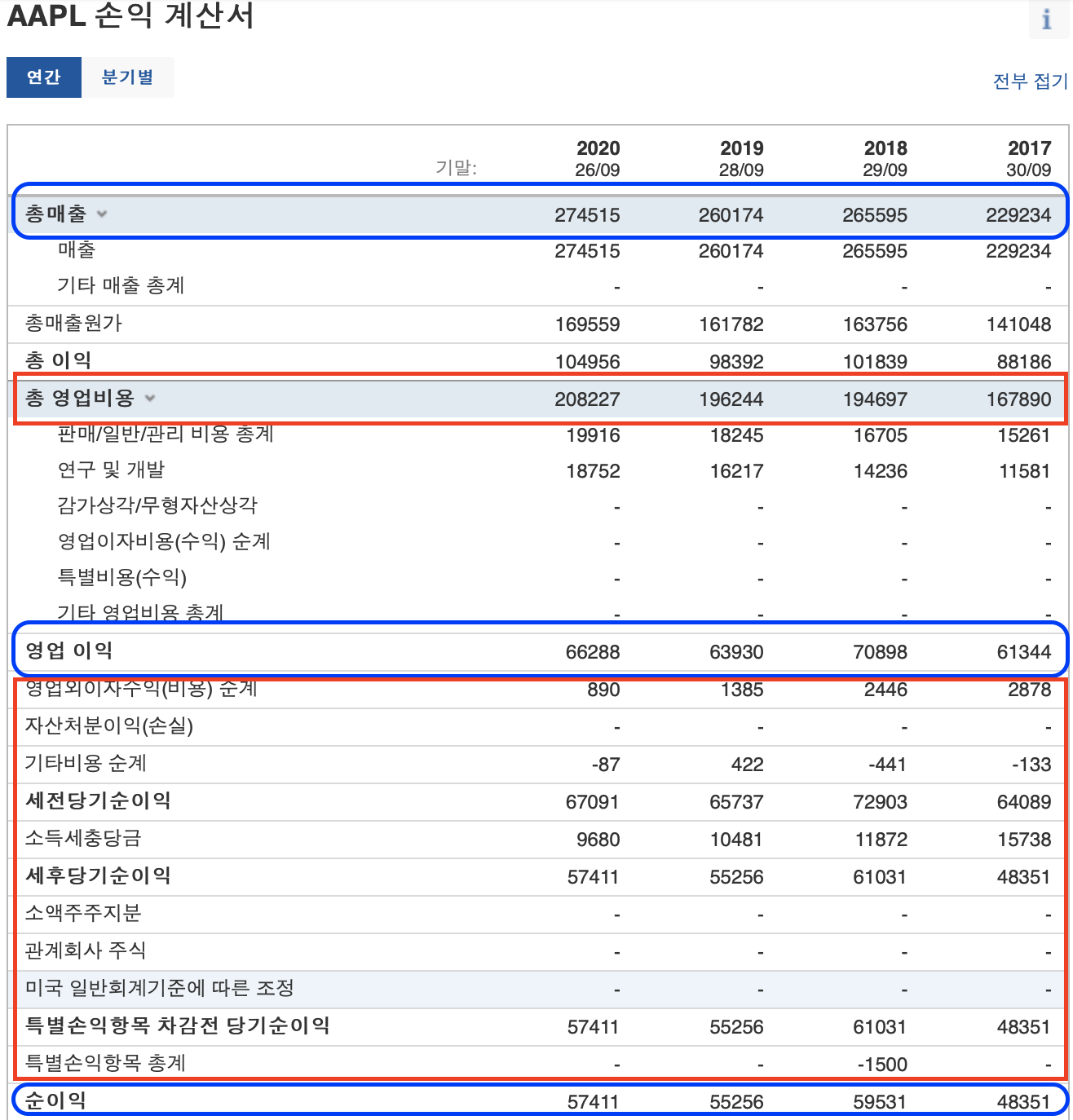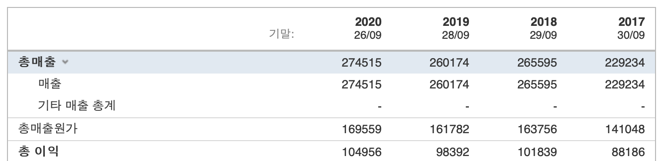 애플을 예시로 보겠습니다. 애플의 연간 총 매출을 보면 2017년 부터 꾸준히 늘고 있습니다. 2019년에 주춤 하기는 했지만 2020년도에 다시 회복한 모습입니다. 그래서 총 이익을 보면 계속해서 증가 하고 있는 것이 보입니다.