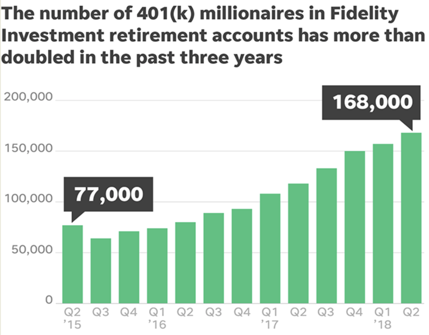 아래 그래프를 보면 401k로 백만장자(Millionaire)가 되는 사람들의 숫자가 점점 늘어나는 것을 볼 수 있습니다.