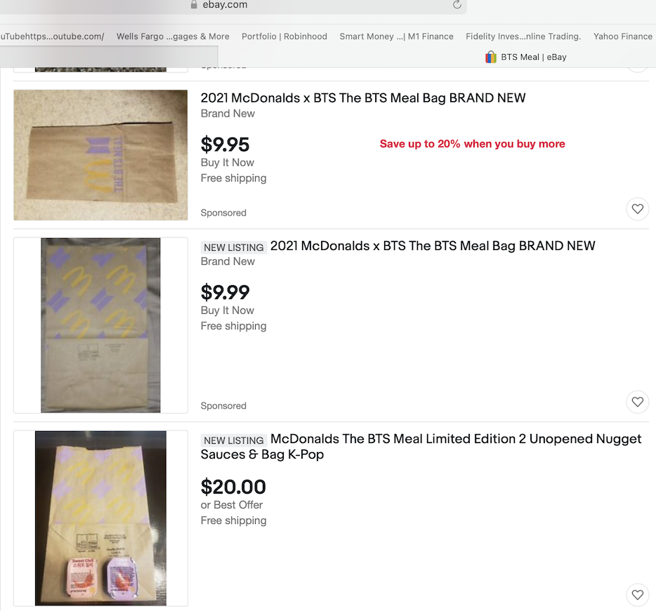 그래서 왜 BTS 포장으로 안주냐고 물으니깐 BTS Meal Set Large를 시켜야 준다네요. 저희도 모르고 간 사실이라 당황해 했더니 직원이 봉투는 하나 주었습니다. 저 봉투가 이베이에서 10불에 팔리고 있다더군요. 소스와 함께 20불에 같이 팔리고 있었습니다.