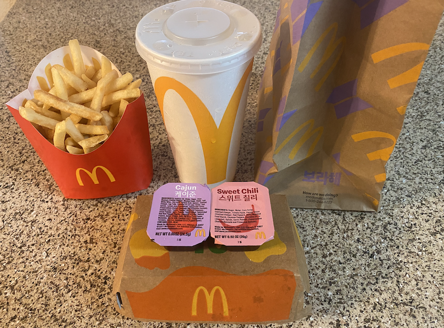 원래 전부 보라색 포장의 치킨너겟 통과 컵, 감자칩 포장을 줬어야 하는데 그냥 일반 통을 포장으로 주더군요.