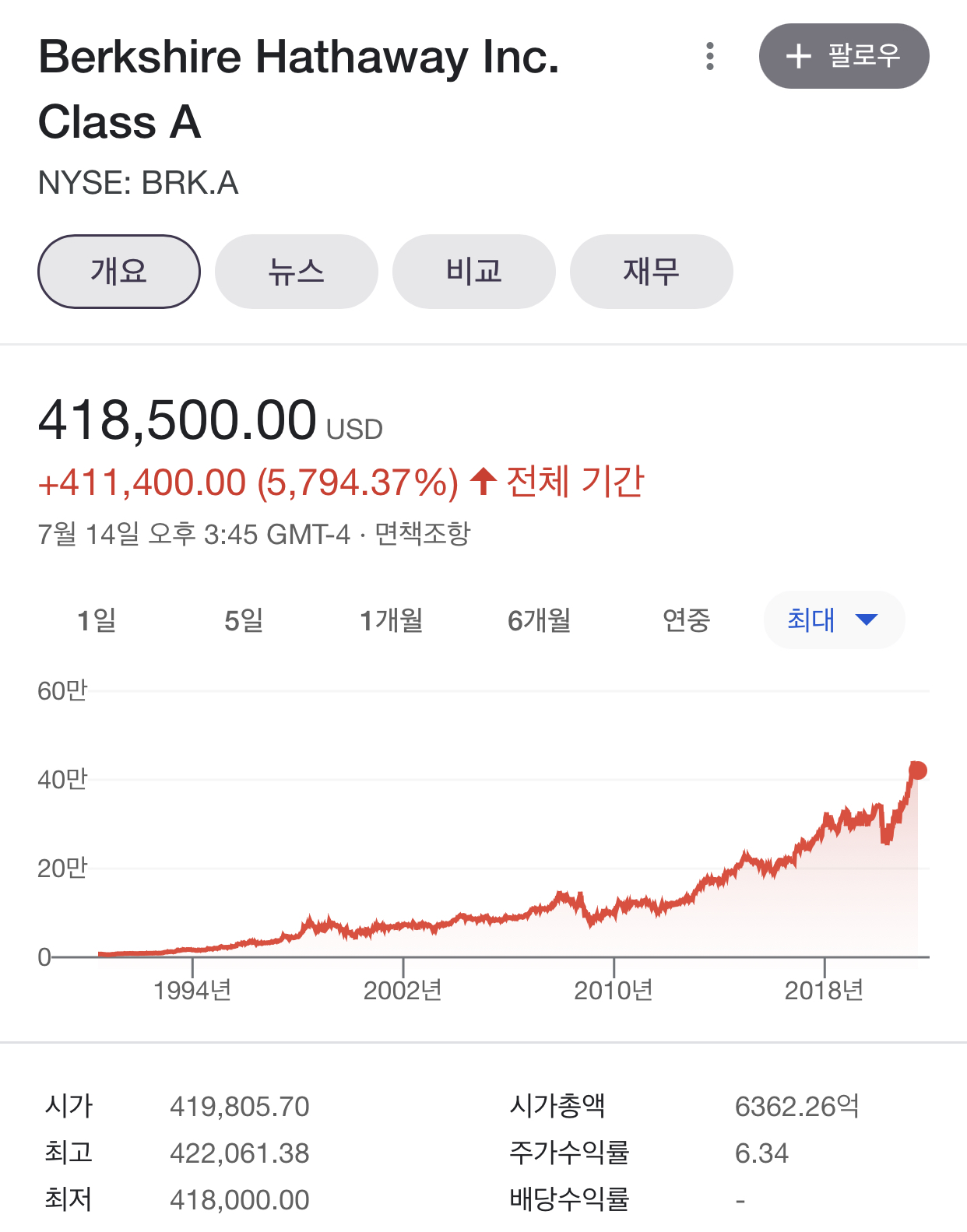 그리고 이 투자금은 버핏이 투자조합을 해산할 무렵인 1969년에는 투자금의 만배인 10억 달러로 불어났다고 합니다.